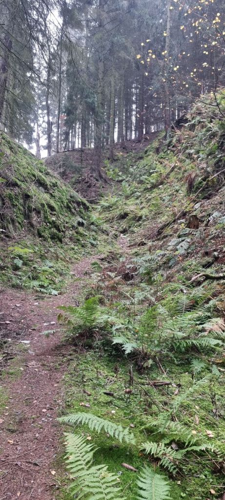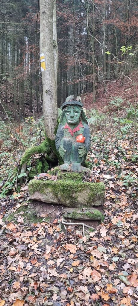 Vor dem Wald komme ich an eine Schutzhütte mit einer Quelle, die zum Verweilen einlädt. Anschließend geht ea dann ordentlich hinauf. Zuweilen muss ichvmich an den Wurzeln der Bäume hochziehen.