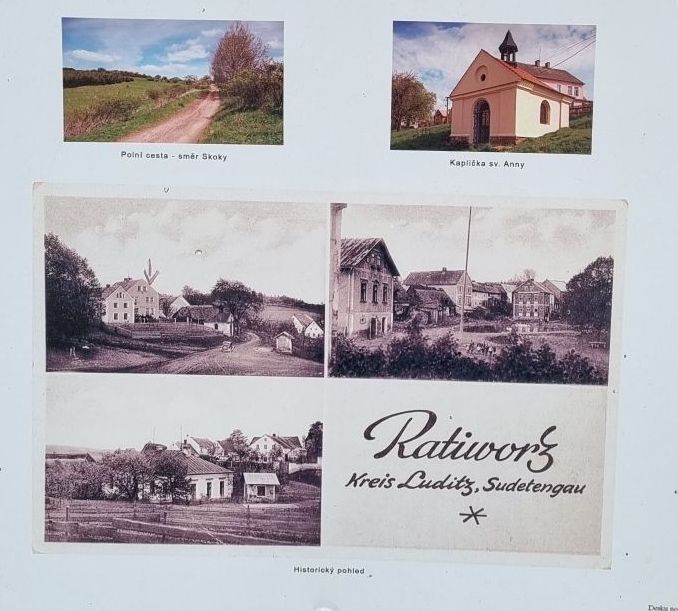 Wiesen, Wasserläufe, Felder und Bäume säumen nun wieder meinen Weg. aich komme durch 2 kleine Dörfer, denen die deutsche Vergangenheit noch anzusehen ist bzw. die Spuren noch gut sichtbar sind. In Udritsch (Udrč) und vor allem in Ratiworz (Ratibor) ist es gut zu sehen. Ein Gedenkkreuz an die hier 1931 – 1946 beerdigten Deutschen in Udritsch, in Ratibor sogar ein Aushang zur Geschichte des Ortes, aus dem hervorgeht, dass seit dem 17. Jh. hier Deutsche wohnten und erst nach dem Krieg Tschechen sich hier ansiedelten.