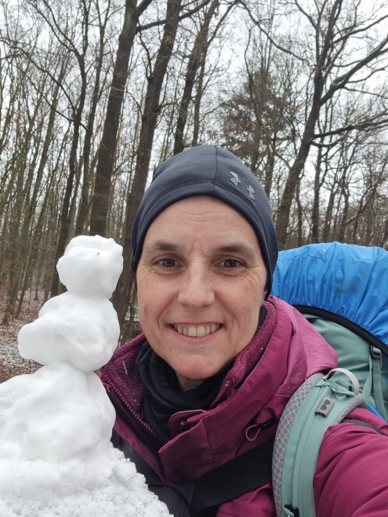 Bis Prag folgten noch 2 Zwischenstopps, kleine Routen mit ca. 9 km. Eine davon durch den 1. Schnee in diesem Jahr, der den Wald in ein kleines Winterwonderland verwandelte. Ich ließ es mir nicht nehmen und baute meinen 1. kleinen Schneemann für diesen Winter.