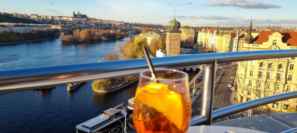 Am Nachmittag noch ein Bummel in der Nachmittagssonne an der Moldau mit einem herrlichen Ausblick über die Stadt von einer Dach-Bar im Tanzenden Haus.