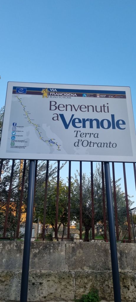 In diese Richtung ging es dann am 28.12. auch weiter. Mein nächster Stop war Vernole. Das erste mal begegnen mir andere Wanderer, die wie ich auf der Via Francigena laufen. Manchmal kommen Radfahrer vorbei und wünschen „Boun Camino“ – Guten Weg. Hier kennt man Pilgerwanderer, hier gehört es dazu, dass Menschen mit großem Rucksack auf der Straße laufen.