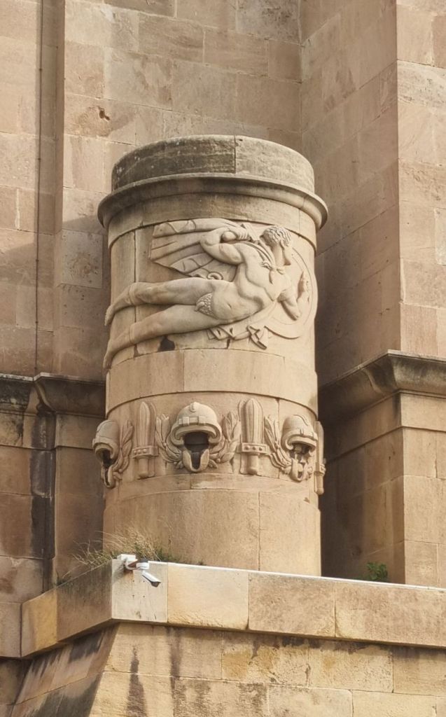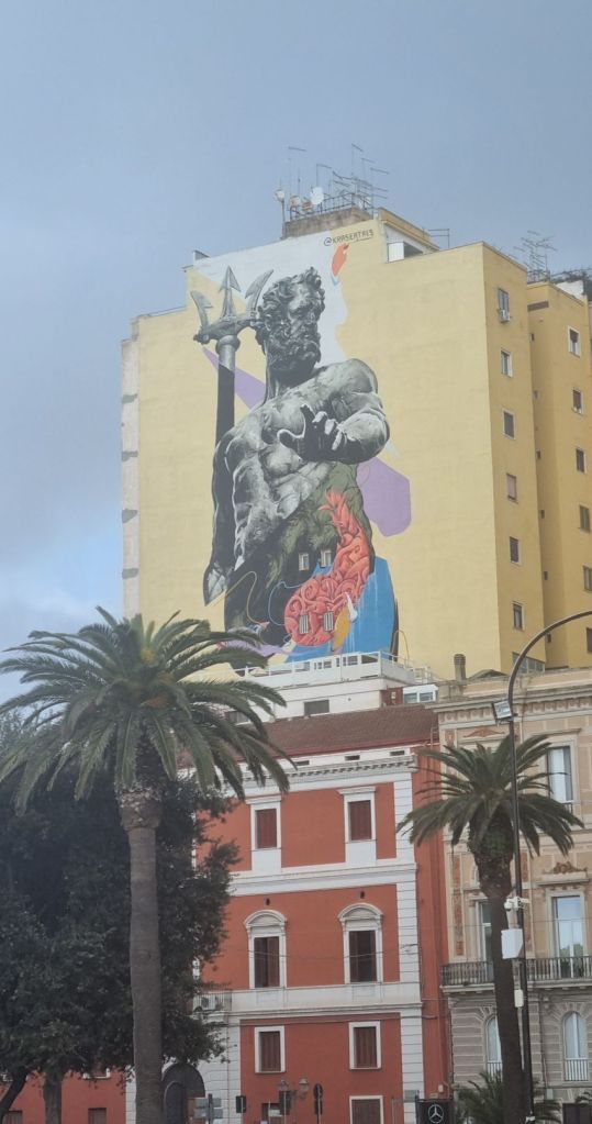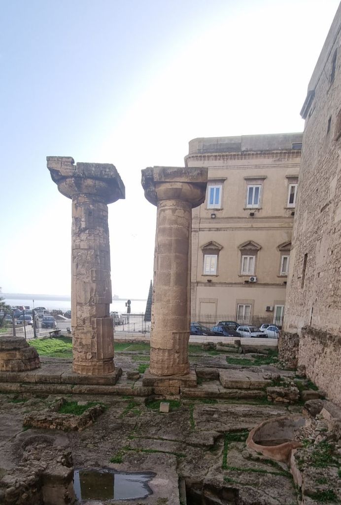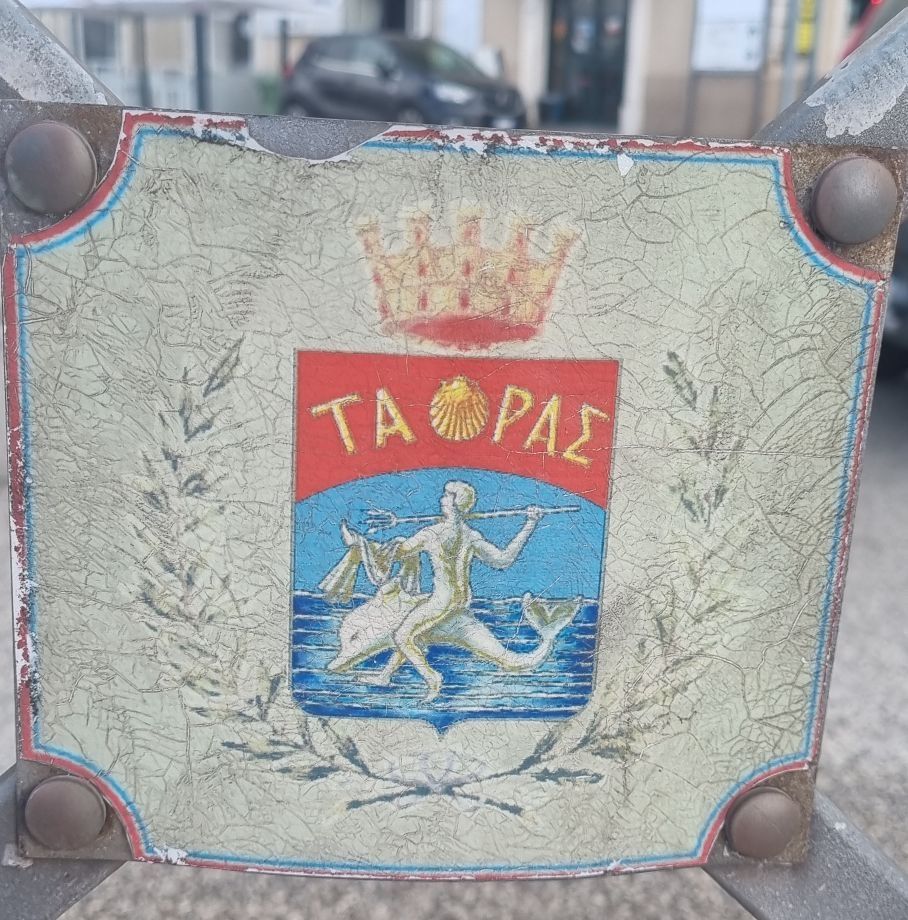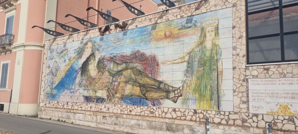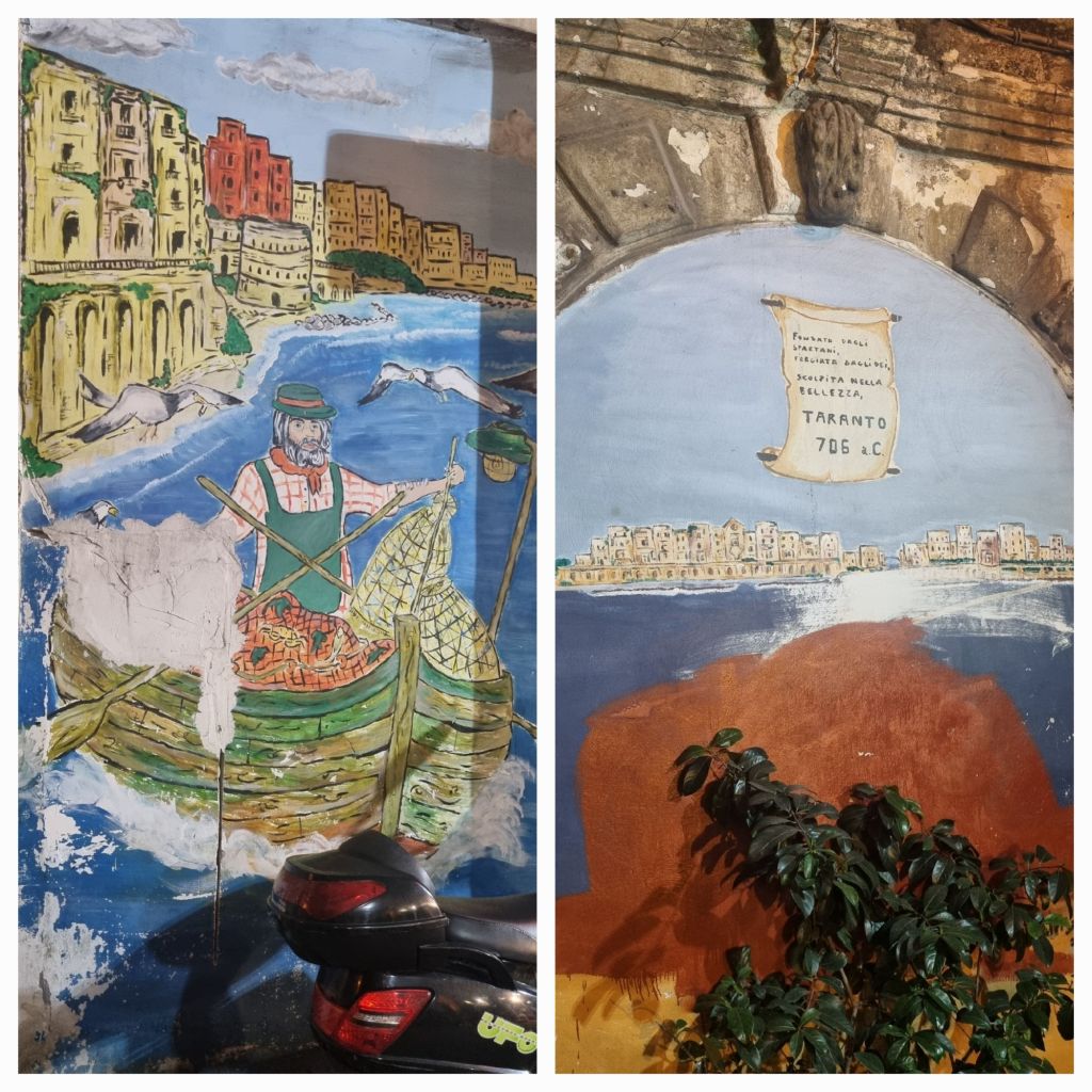 Tarent selbst wurde ursprünglich von den Griechen gegründet, weshalb nicht nur das Wappen gelegentlich nit griechischen Buchstaben zu sehen ist, der Meeresgott am Hauswanndbild ist dann auch Poseidon und die Hauptkirche in der Altstadt hat etwas von einem griechischen Tempel. Es stehen auch noch 3 Säulen eines alten griechischen Tempels am Eingang zur Altstadt rum.