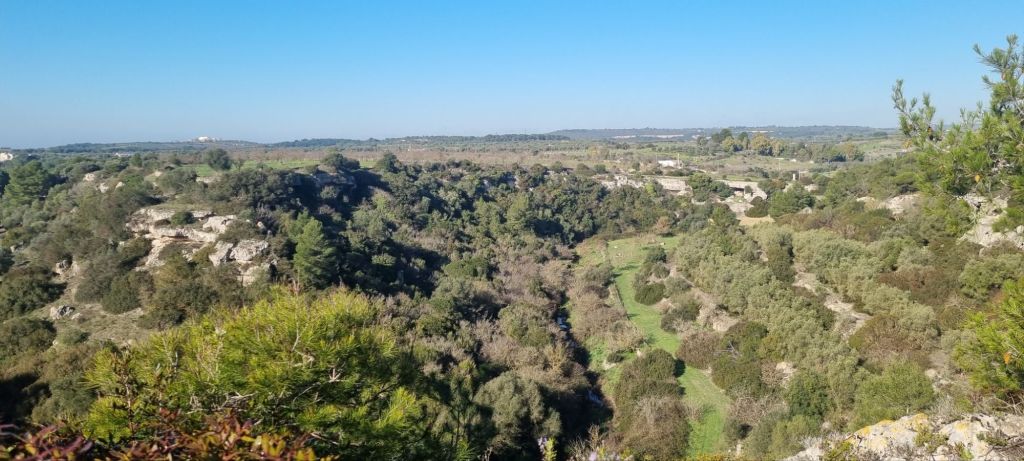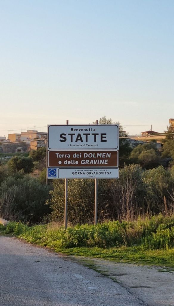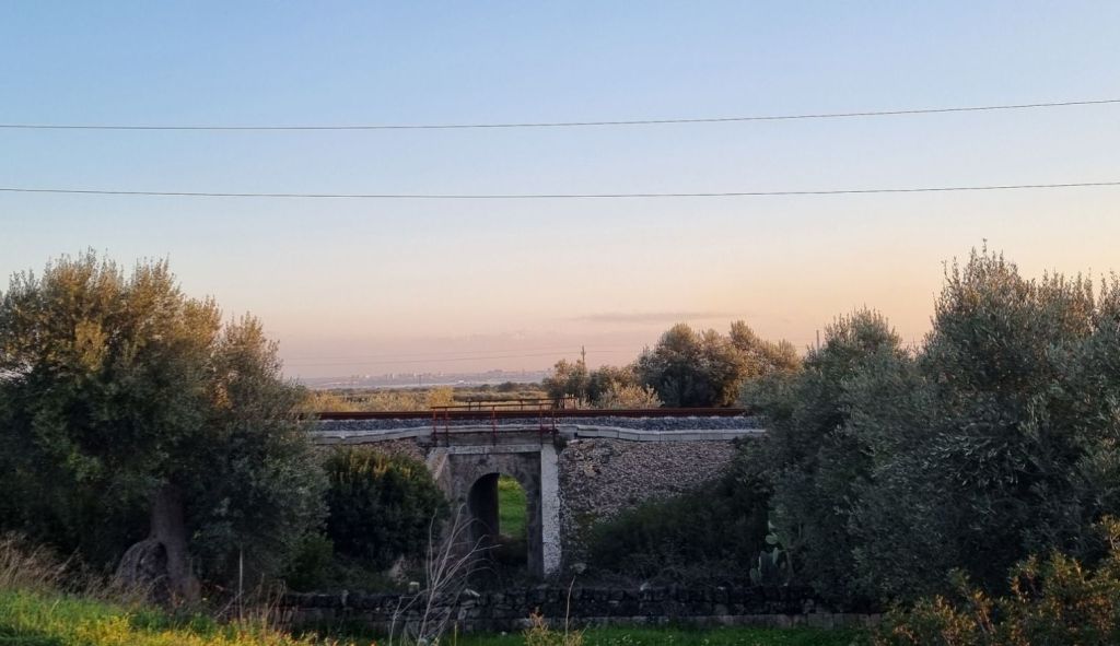 Zur Pause bin ich in Crispiano. In einem Caffè bekomme ich nicht nur diesen, sondern neben Strom fürs Handy auch was zum Mittag. Über eine alte Eisenbahnbeücke geht es weiter. Der Mann, den ich gefragt habe, ob ich über die Brücke zu Fuß gehen könne, muss auch gedacht haben…. Die Brücke war für Autos gesperrt und Schienen liegen da schon lange nicht mehr. Eine reine Fußgängerbrücke. 🙈😊
