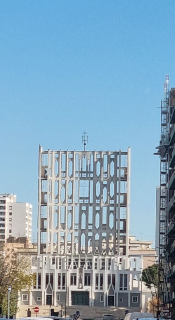Es gibt auf der einen Seite Bauten aus der Mussolini-Zeit, die da sehr trutzburgartig daher kommen. Und dann wieder ein Kirchenbau, der gitterartig Leichtigkeit zeigt.
