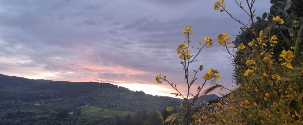 Meine Pause gibt es wieder unter einem Olivenbaum, diemal mit Blick auf Obstblüten. (das Stadtkind hat natürlich keine Ahnung, was da so rosa blüht.)