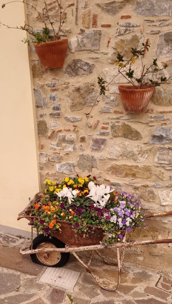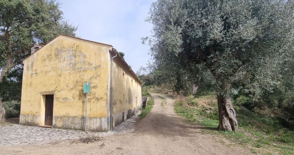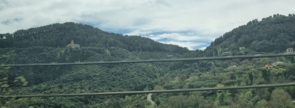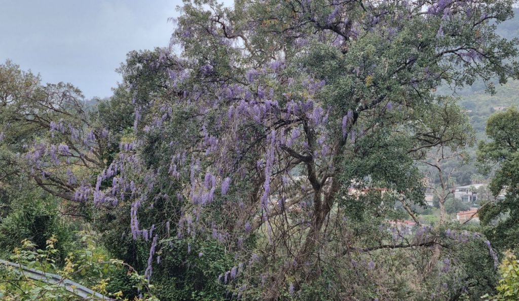 Und der Blauregen überzieht die Bäume mit einem helllilanem Blütenkleid! 🤩 Es geht weiter durch den Wald und es scheint als tauche ich wieder in eine Gegend mit einer leicht anderen Einstellung zum Leben. Dann wird das Verkehrsschild eben am Baum aufgehangen. Und dann steht scheinbar mitten im Wald eine Kapelle. Es ging danach aber mit einer richtigen Straße weiter und ich sollte allmählich in Ispani ankommen.