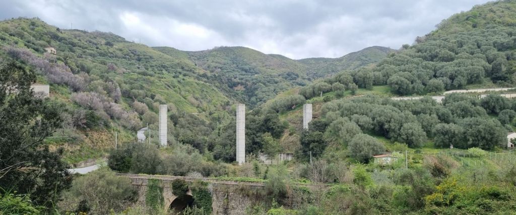 Es geht ganz schön hoch und runter und wieder hoch und ein ganzes Stück ins Tal rein. Ich komme an ein paar Steelen einer Brücke vorbei und kann nicht ausmachen, ob es ein abgebrochenes Bauprojekt oder alte Reste sind. Es sieht jedenfalls sehr unfertig aus.