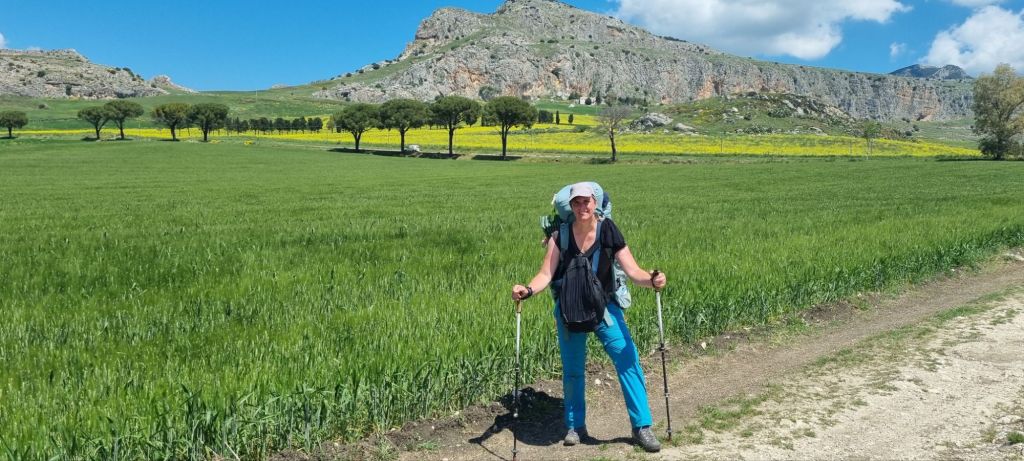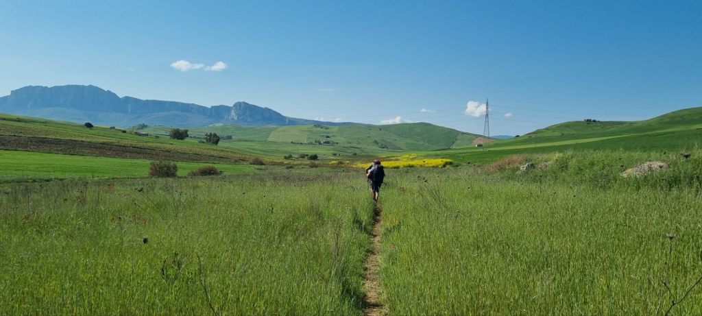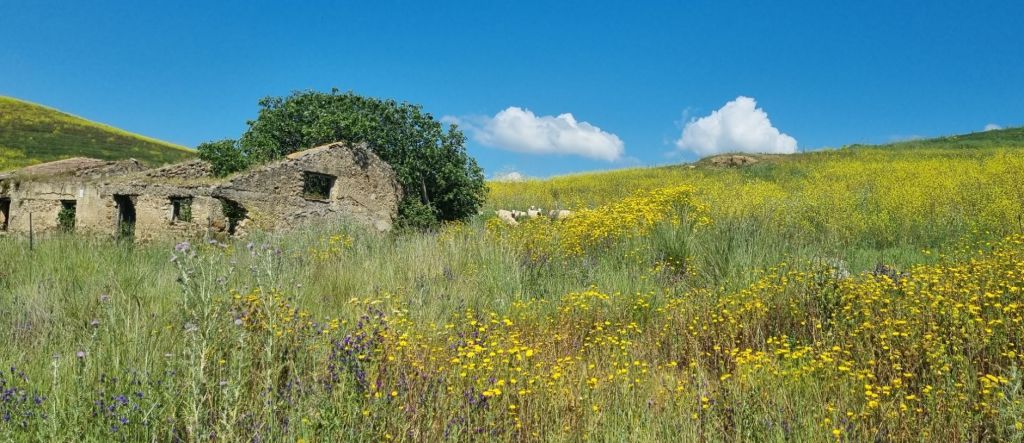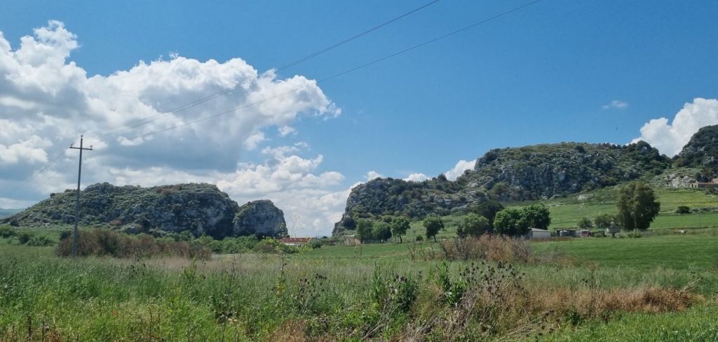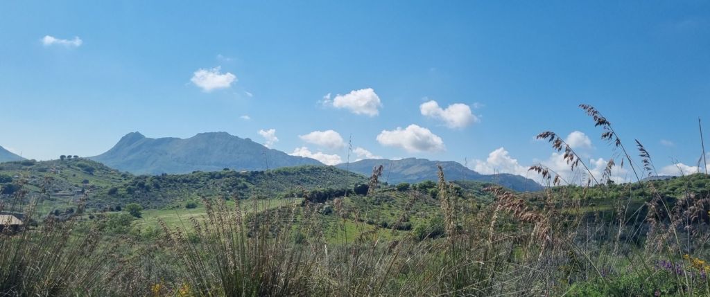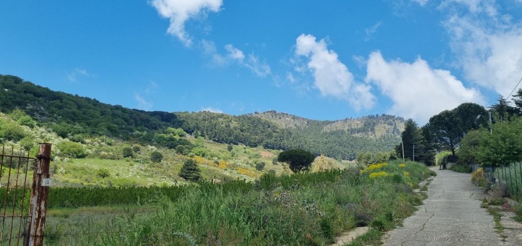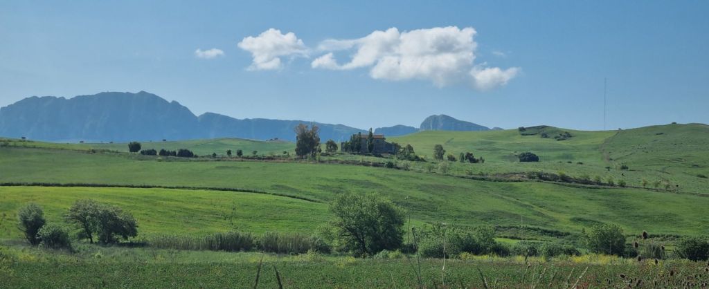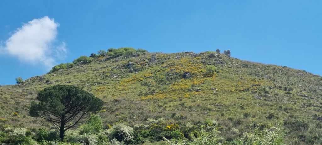 Am nächsten Tag war die Welt wieder sonnig, es ging weiter, natürlich erstmal bergauf, und als erstes an einem Kreuzweg entlang. Kurz danach eröffnet sich mir die grüne Hügellandschaft Nordsiziliens. Grüne Hügel mit Felsen soweit das Auge schauen kann, ab und an einige Gehöffte. Unbeschreiblich schön!