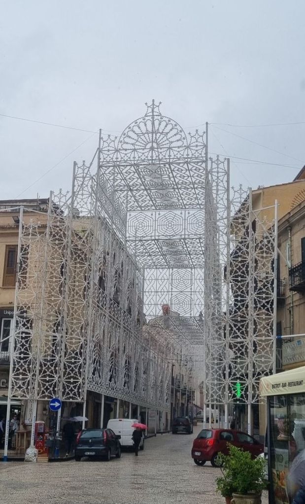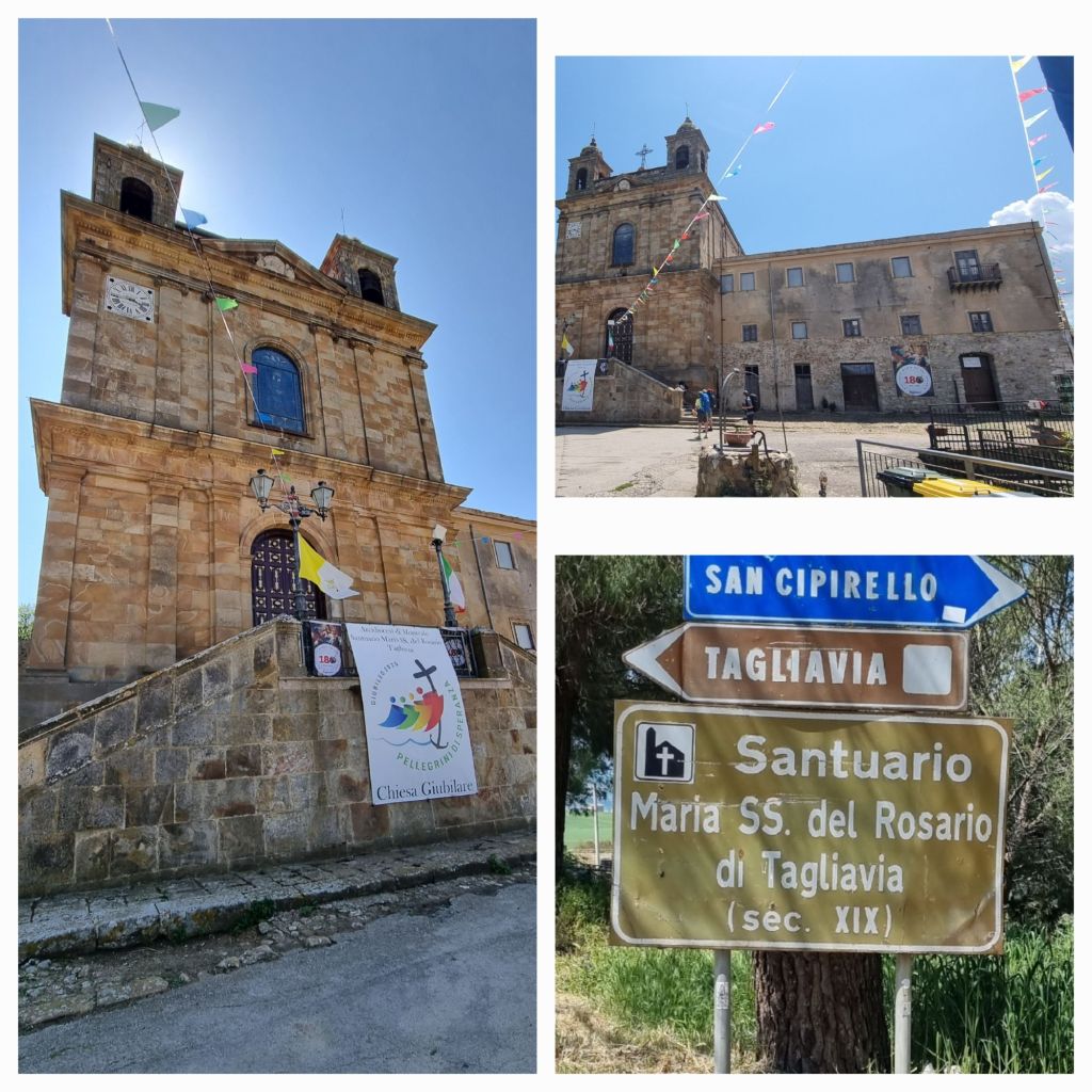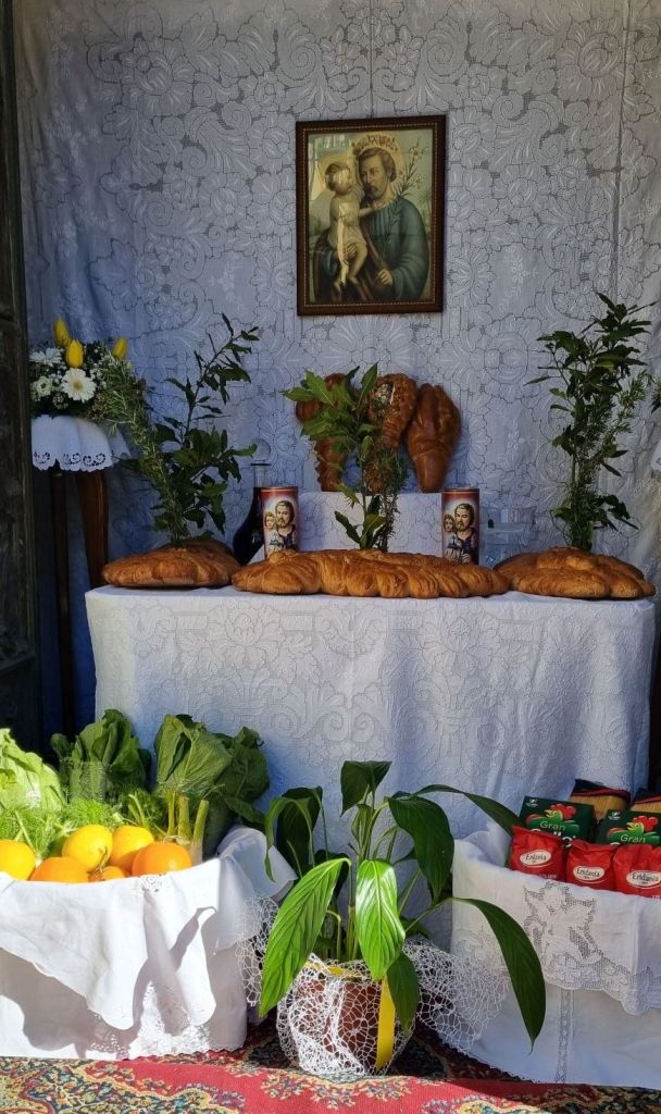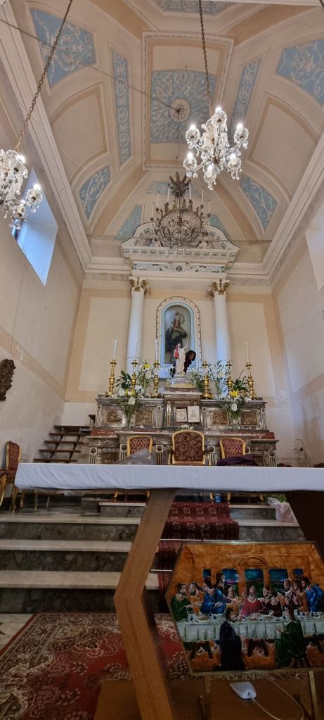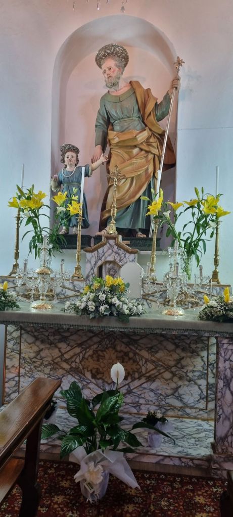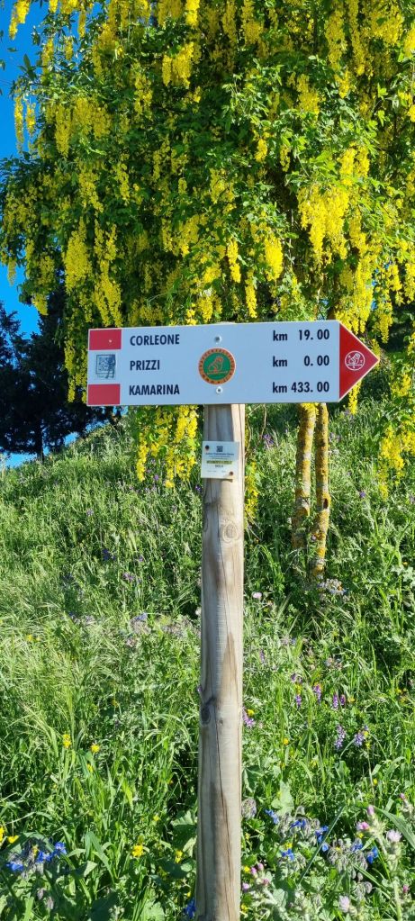 Bei der Ankunft sagt mir dann die Hinweistafel nicht nur klar und deutlich, das ich angekommen bin, Fliesen im Boden sagen auch, wo es nun hingeht. An der Kirche vorbei bestaune ich den Gabentisch, bei den Damen, die innen aufräumen erfahre ich, es ist Ehrentag von San Giuseppe Lavoratore – 1. Mai, Tag der Arbeit. Auch dafür gibt es einen Schutzheiligen. Wir haben hier in Prizzi zu sechst noch einen schönen Abend, dann kommt der Zeitpunkt des Abschieds. Die Fünf ziehen am nächsten Tag weiter, ich ruh mich aus. Auf die anderen warten nach der Wanderung wieder Verpflichtungen daheim.