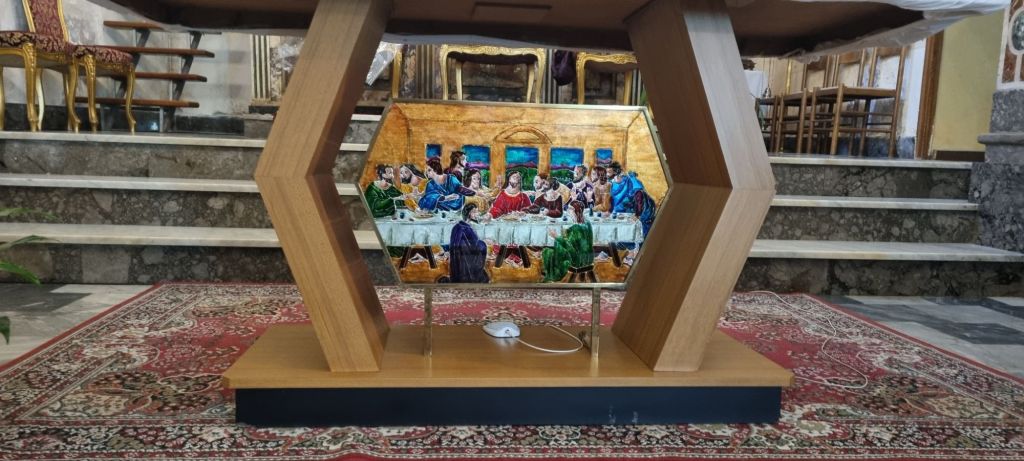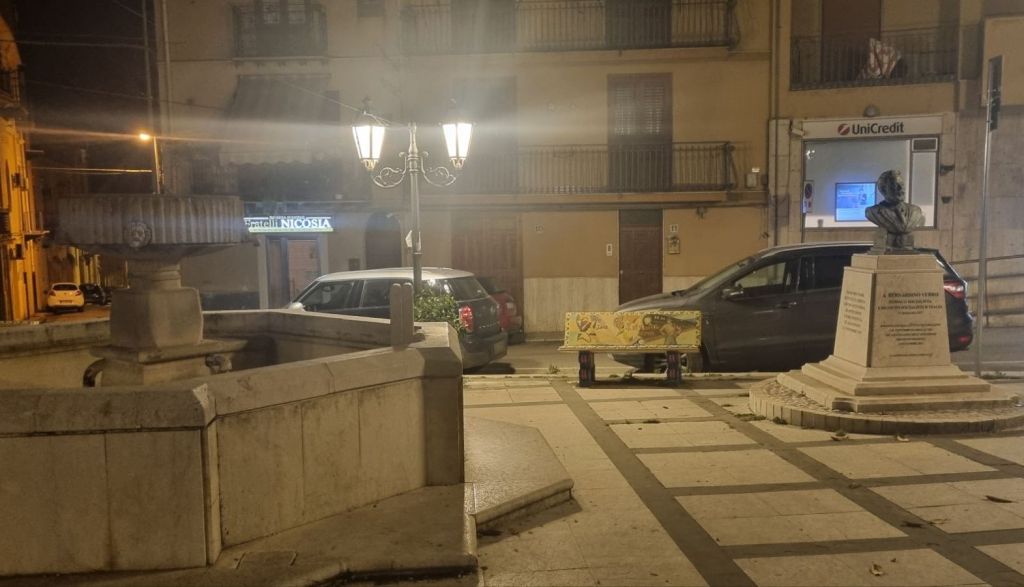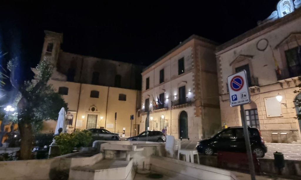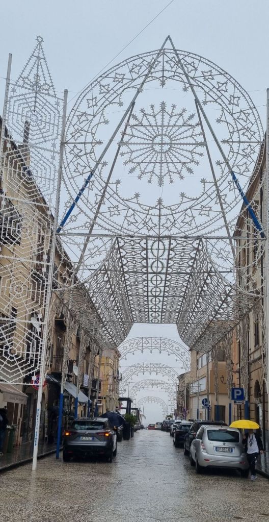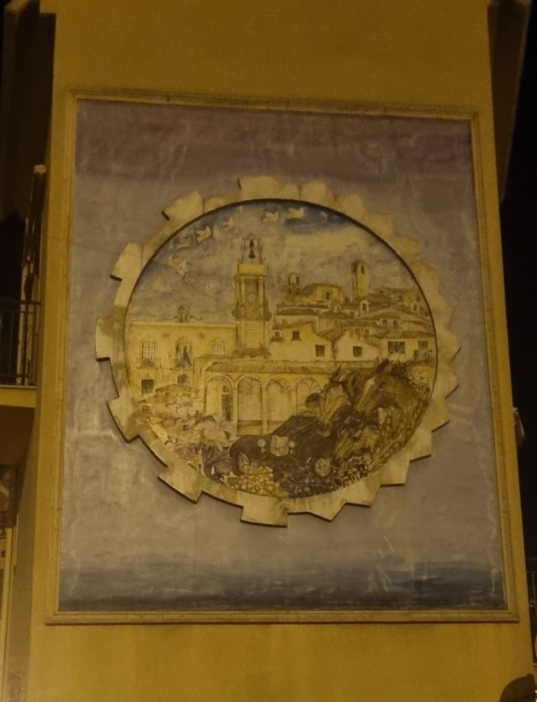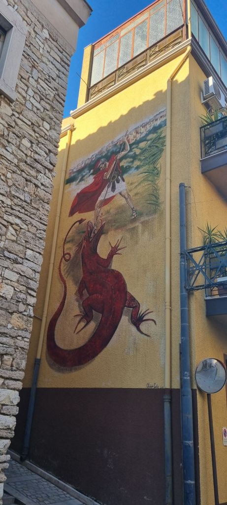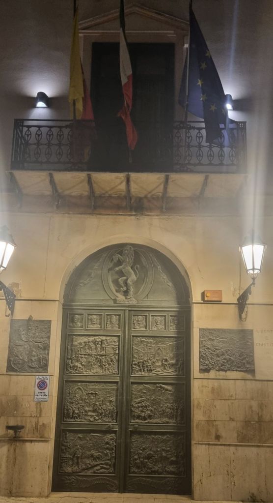 Bei der Ankunft sagt mir dann die Hinweistafel nicht nur klar und deutlich, das ich angekommen bin, Fliesen im Boden sagen auch, wo es nun hingeht. An der Kirche vorbei bestaune ich den Gabentisch, bei den Damen, die innen aufräumen erfahre ich, es ist Ehrentag von San Giuseppe Lavoratore – 1. Mai, Tag der Arbeit. Auch dafür gibt es einen Schutzheiligen. Wir haben hier in Prizzi zu sechst noch einen schönen Abend, dann kommt der Zeitpunkt des Abschieds. Die Fünf ziehen am nächsten Tag weiter, ich ruh mich aus. Auf die anderen warten nach der Wanderung wieder Verpflichtungen daheim.
