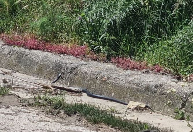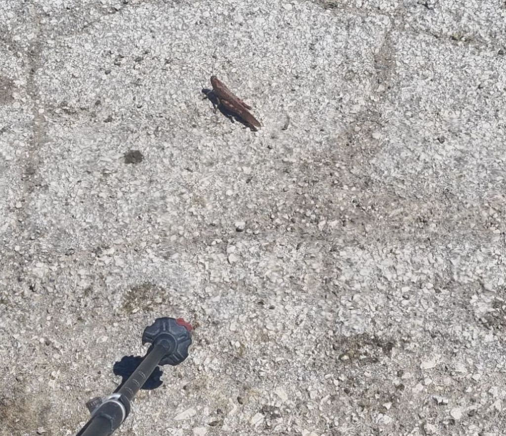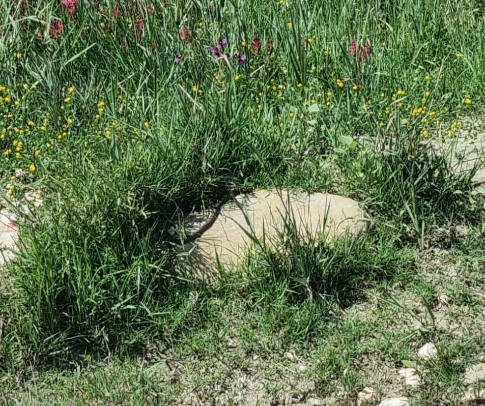 Danach geht es aber eine gemütliche Weile hinab und durch das Tal. Das Gehöft unterwegs ist leider verschlossen, aber immerhin finde ich ein schattiges Plätzchen, um Pause zu machen. Unterwegs habe ich aber auch mit ganz anderen „Gefährten“ zu tun – eine Schlange, eine große Heuschrecke lässt sich fotografieren und unzählige Bienen. Wer stellt den geschätzte 30 Bienenkörbe unmittelbar am Wanderweg auf? Das ist ziemlich tricky. Man muss durch deren Einflugschneisse hindurchwander. Mund zu, Kopf runter und Marsch! 3x hatte ich das Vergnügen. Und immer wieder die Angst, die fliegen ins Gesicht. Beim ersten Mal hatte sich eine am Rucksack verklemmt, so dass ich den erstmal abwerfen musste, beim 2. Mal dann doch einige im Gesicht und dann doch gewedelt und nur noch gerannt. Das 3. Mal ging es dann. 4 Bienenstiche! Nichts schlimmes, aber es war schon irre.