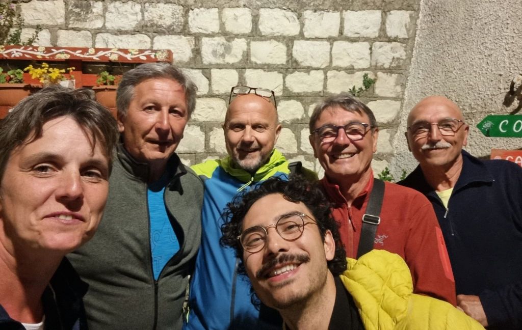 Ich schließe mich denen ein Stück weit an und lasse mich etwas mitziehen. Hemeinsam durchstreifen wir gefühlt endlosen Feldern und Wiesen mit roten und gelben Blumen. Es sieht wunderschön aus und es riecht und summt überall unaufhörlich. Die Felsen im Hintergrund geben der Landschaft einen eigenen Charakter. Es sieht unglaublich aus. Wir machen Rast an einer Kirche. Auf den Stufen sitzen und was essen und trinken tut gut. Wir kommen ein wenig ins Gespräch – soviel wie es mit den Sprechbarrieren irgend geht. Sie kommen aus dem Norden Italiens, aus Piermont und wandern wohl öfter zusammen, auch durch die Berge. Das erklärt dann auch deren Tempo 😉.