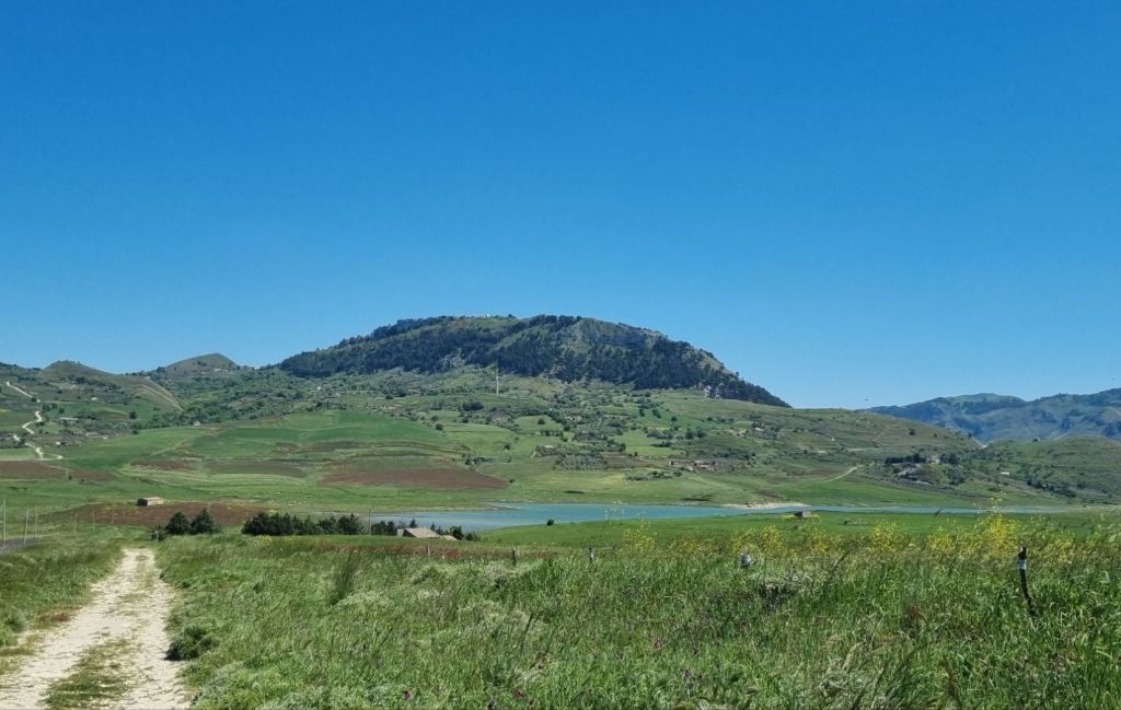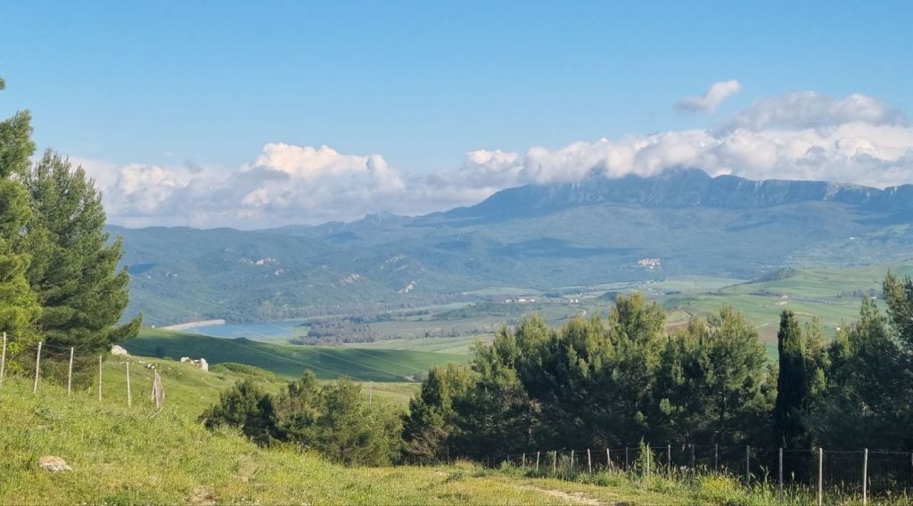 Kurz vor Prizzi – das natürlich auf einem Berg liegt 😒 – ist dann noch ein See, an dem ich eigentlich Pause machen möchte. Die Idee vonn „Füße ins Wasser halten“ kann ich streichen, es ist alles mit Schilf bewachsen und dient zudem als Weide für Kühe. Aber einen kleinen Schattenplatz unter einem Baum am Wegesrand finde ich dennoch Verschnaufpause vor dem letzten Stück Weg, der mit am Ende 19 km auch eine ordentliche Länge hat.