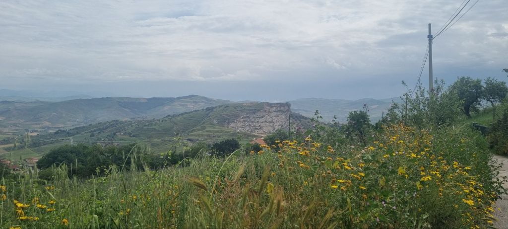 Meine Laune war auch am nächsten Tag nicht sehr viel besser. Es ging heute zwar nicht allzusteil bergauf, aber dennoch. Der Weg führte ins Tal, über die Schnellstraße und wieder bergan durch ein Dorf, um danach wieder ein ganzes Stück bergab und durchs Tal zu gehen. Muss das sein? Warum in den Ort auf den Hügel wandern, um dann wieder hinunter zu gehen? Das Ziel des Tages hieß Sutera, die Stadt die um einen Felsen drumherum gelegen ist. Es ging eigentlich erst zum Schluss in die Stadt rein etwas bergan, bis dahin sollte der Weg eigentlich relativ flach sein – bis auf dieses Dorf auf dem Hügel. Meine Motivation war ziemlich gering nach dem auf und ab am gestrigen Tag.