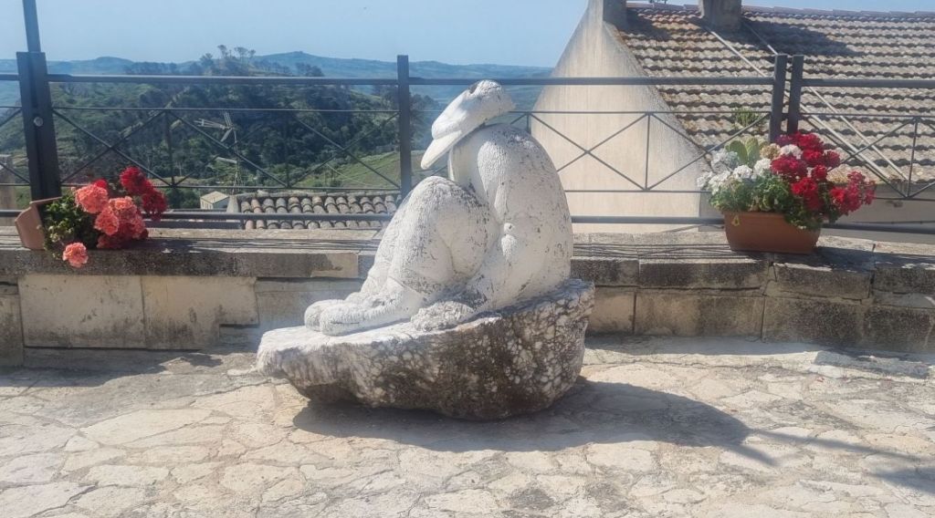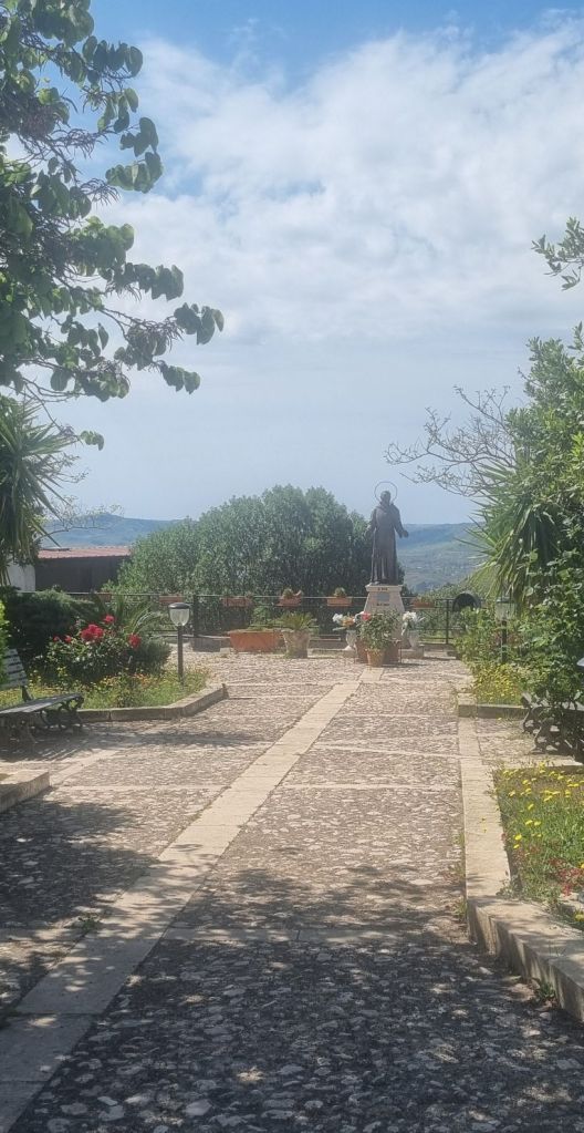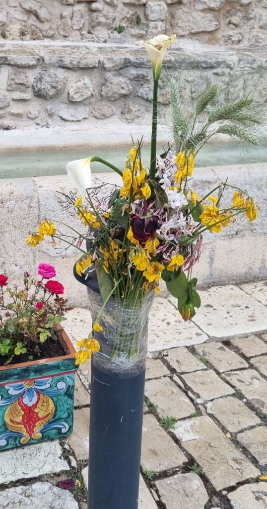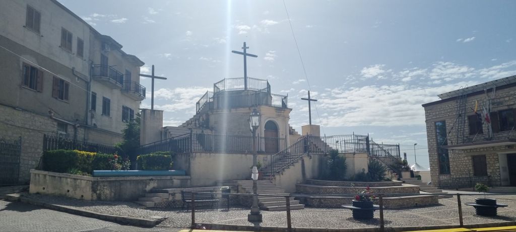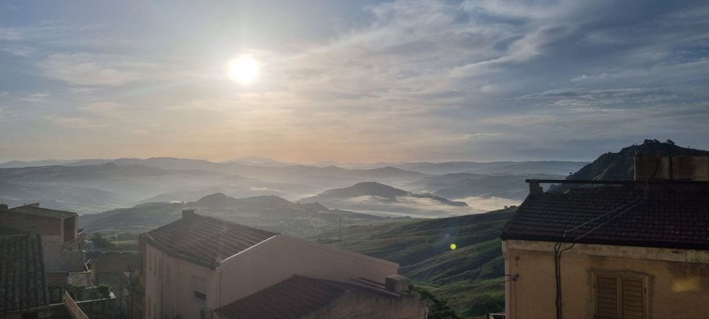 Pause in Sutera. Meine Füße, vor allem der Knöchel danken. Am Morgen geht es schon wieder etwas besser. Nach dem Frühstück verabschiede ich mich von Alex und Guiseppe. Ich mache mich nach etwas Pause auch auf, eine kleine Runde durch den Ort. Und ich will etwas Obst und Brot kaufen. Der Obstmann kommt dankenswerterweise durch den Ort und hält gerade hinter dem Haus als ich los will.