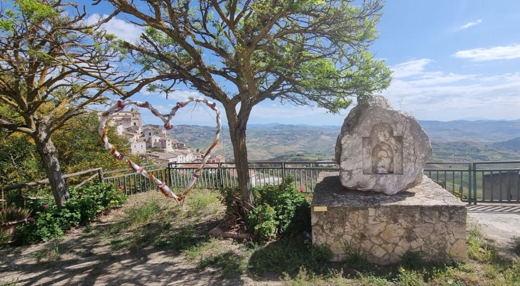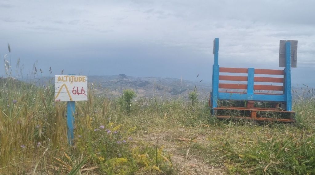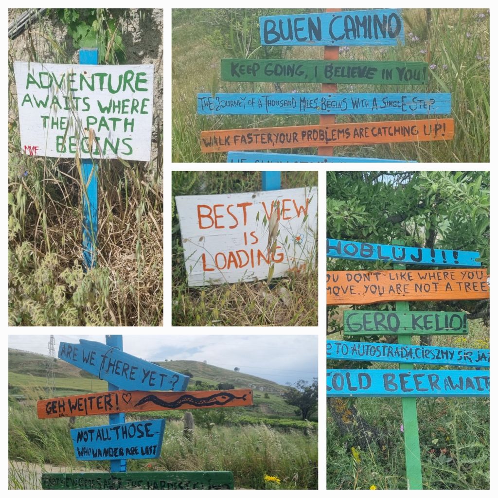 Also geht es am nächsten Tag weiter bis nach Grotte. Wieder steht als erstes ein ordentlicher Anstieg an. Wie schon gestern stehen auch hier am Wegesrand bunte Schilder, die mit motivierenden Sprüchen versehen sind. Zum Beispiel auf dem Weg hinauf, kurz vor dem Gipfel der Hinweis „Best view ist loading…“. Oben wartet eine ebenso bunte Bank und man kann in der Tat einen herrlichen Ausblick genießen. Ich sehe Milena im Tal, die Berge und sogar in der Ferne den Felsen von Sutera. Ich kann beobachten, wie zwischen den Tälern und Hügeln die Wolken entstehen.