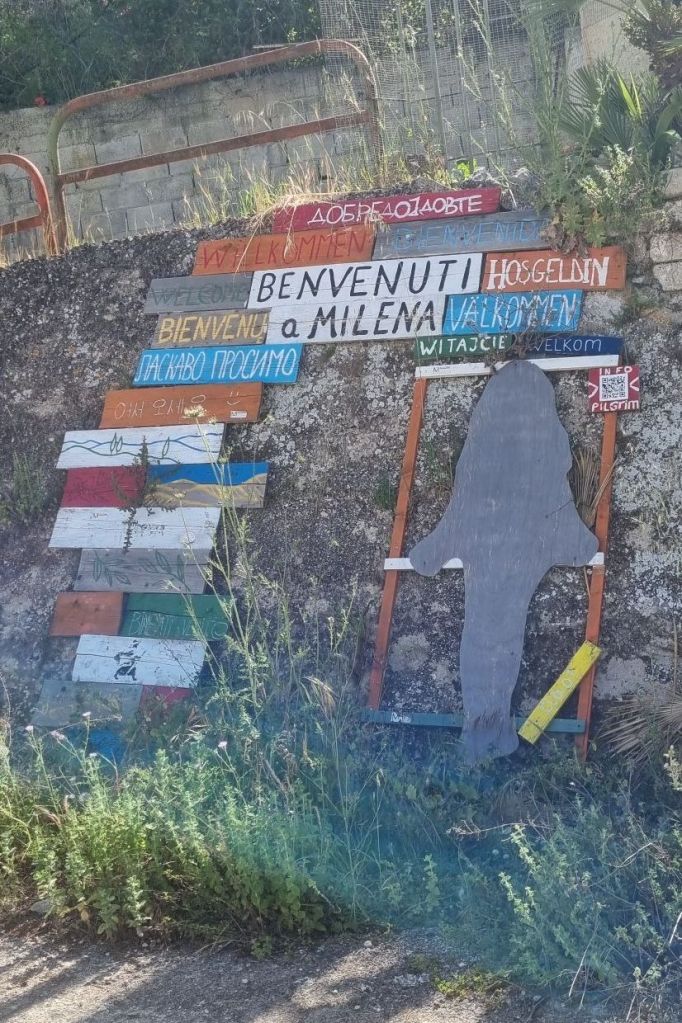 Die nächste Etappe führte mich zunächst nach Milena. Die andere Gäste am Abend nahmen die nächsten 13 Kilometer bis Grotte gleich mit, ich nicht. Die Strecke hatte eh in sich. Ich hatte mitbekommen, und wurde am Abend auch nochmal darauf hingewiesen, dass es im Tal einen Fluss zu Fuß zu queren galt! Sowohl Alex hatte mich darauf aufmerksam gemacht. Als auch das zweite Pärchen am Abend, die in entgegengesetzten Richtung nach Palermo unterwegs waren und diesen an dem Tag durchquert hatten. Aber es sei nicht sehr tief und mit Wanderstöcken gehts. Tranquilla! Nur die Ruhe bewahren, dann geht’s. Tranquilla! (so lernte ich wieder ein neues italienisches Wort 😉)