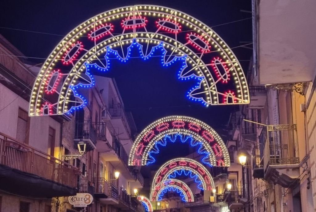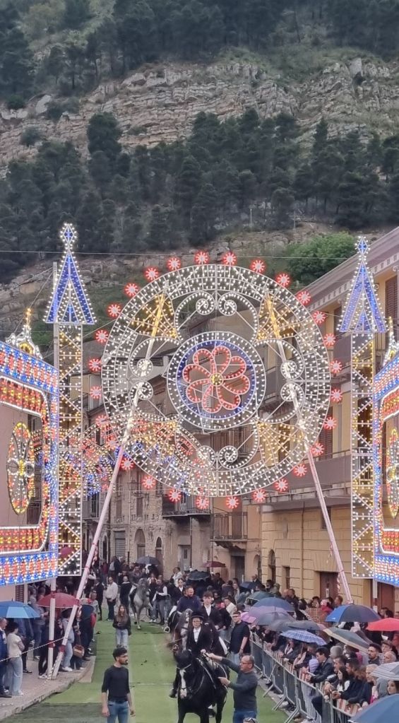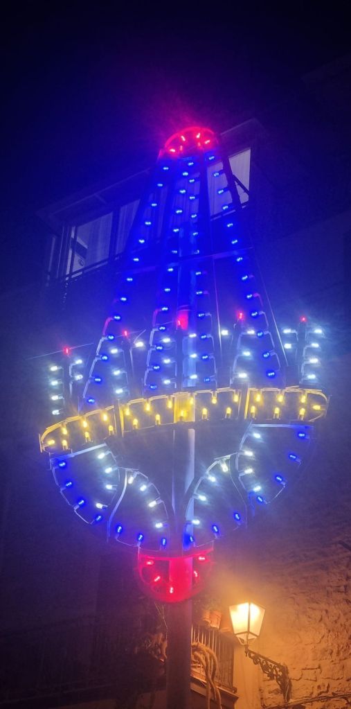 Und dann das! Die ganze Innenstadt war festlich geschmückt mit der Lichterdeko. Es war für Autos gesperrt und das Programmplakat verriet, gestern war Prozession (leider verpasst) aber heute ist nochmal Fest. Na dann! Ist ja das Abendprogramm klar. Und ich traf die zwei anderen Wanderer wieder, Alex und Giuseppe aus Catania. Wir wollten uns eigentlich bei den Easensständen treffen, aber bei den ganzen Menschen hat das natürlich nicht geklappt. Heute also mal nichts mit groß ausruhen. Und das nach der langen Strecke!!! Na wird schon passen.