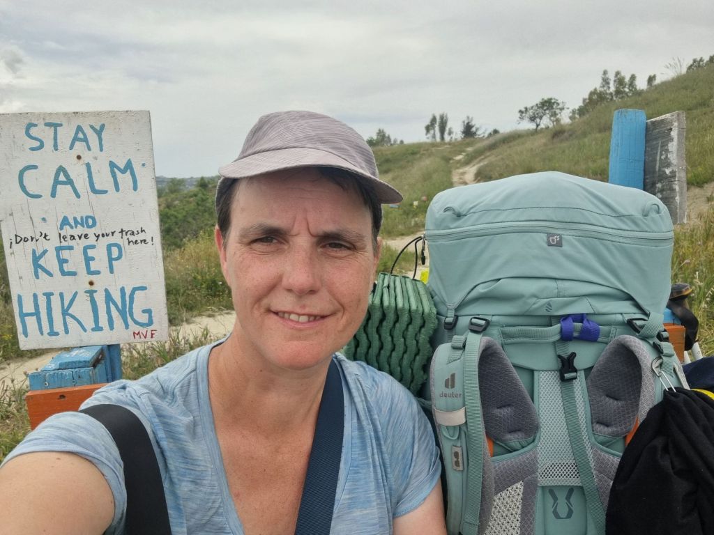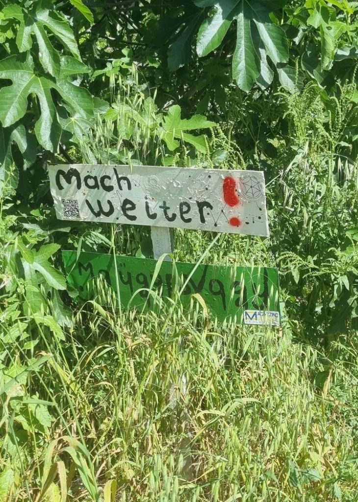 Ich hatte aber mal wieder nicht daran gedacht, das der Wanderweg manchmal auch etwas quer durch Feld und Wiese gehen kann. Das heißt unebener Boden (bei meiner mäßig vorhandenen Trittfestigkeit 🫣), immer wieder hoch und runter, aber und an ziemlich ordentlich hoch bei knallender Sonne….