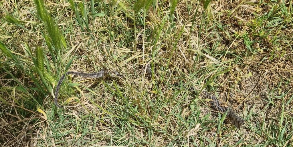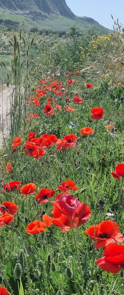 Zum Ort hinaus ging es erstmal an der Kapelle für den Ortspatron Fra Vitale Lino und am Denkmal der Mafia-Opfer vorbei und dann ein Stück die Straße entlang. Bis es dann in den Wanderweg abging. Durch die Wiesen – zum Teil schulterhoch standen die Pflanzen, durch die der Pfad aber gut erkennbar war. Aber dennoch mit Vorsicht zu gehen. Unebenheiten im Boden und unter dem umgeknickten Pflanzen lagen gern mal noch größere Steine, so war Vorsicht geboten. Und wie war das hier gibts ja auch Schlangen! Also Wanderstöcker raus und immer Boden testen und klopfen. Mich überholte dann ein anderes Wanderpärchen, das ich gestern schon getroffen hatte und die auch in der gleichen Unterkunft waren. Also lass ich die doch vorgehen und habe eine Idee, wo es lang geht und der die Schlangen verscheucht 😉.