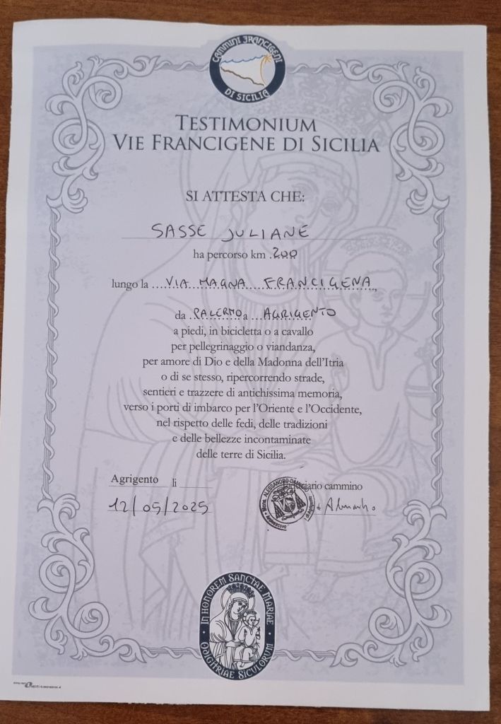 Ich komme erschöpft aber glücklich in Agrigent an und zum Einmarsch läuten die Glocken. Sehr schön. Ich hole mir mein Testomonium ab und ich gönne mir ein paar ruhige Tage in Agrigent. Und dann wird es im Valle di Templi wieder sehr griechisch.