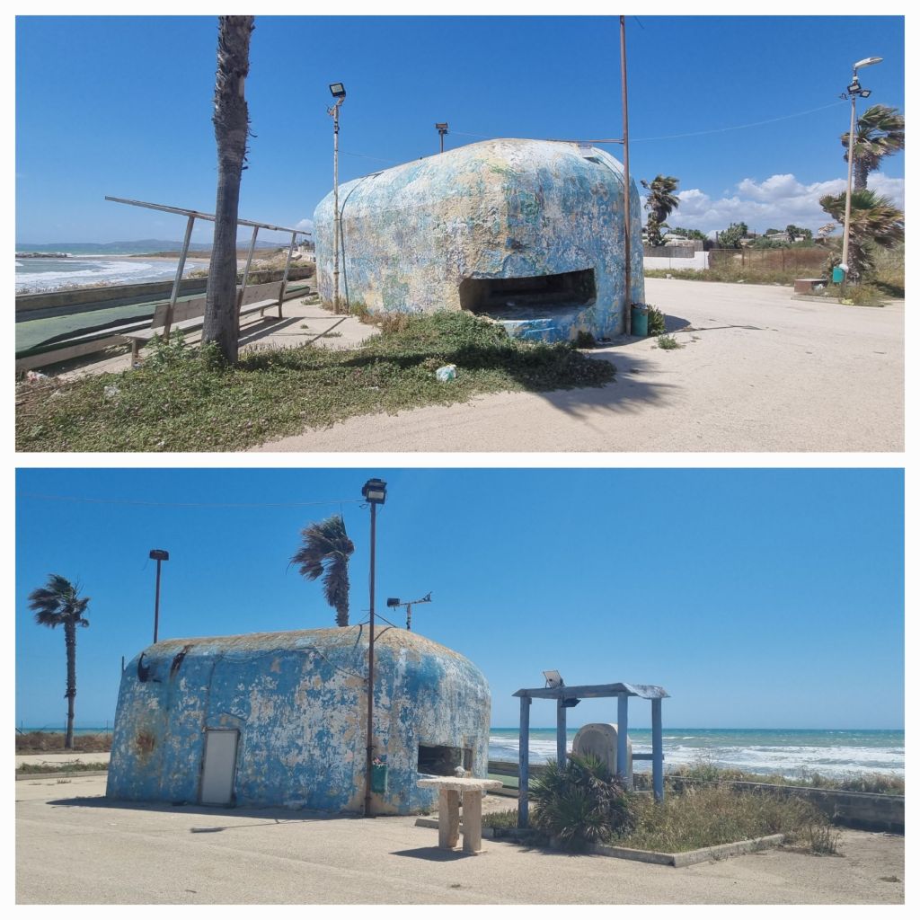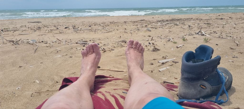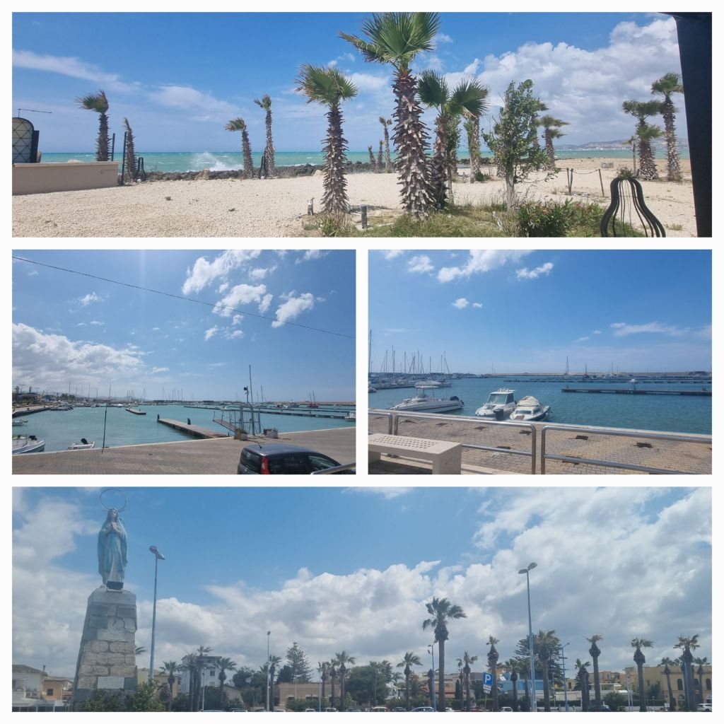 Zum Abschluss dieser Wanderung habe ich mir 3 Tage in einem Wellness-Hotel am Meer gegönnt. Mit dem Bus fahre ich nach San Leone, das südlich von Agrigento direkt am Meer liegt. Ich steige in der Ortsmitte am Hafen aus. Ich habe nicht nur noch reichlich Zeit bis zum Check-in, ich möchte zudem die letzten 4 Kilometer am Strand entlang laufen. Ich laufe allerdings nicht direkt am Strand, sondern an der Strandstrasse und genieße immer wieder den Blick aufs Meer. Es ist ziemlich windig, das Wetter lädt also eher noch nicht zum Baden ein.
