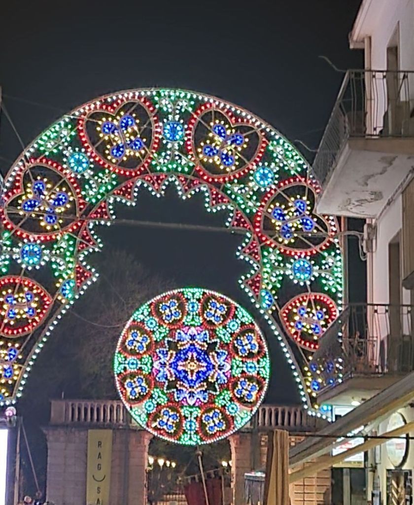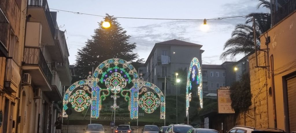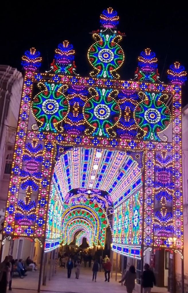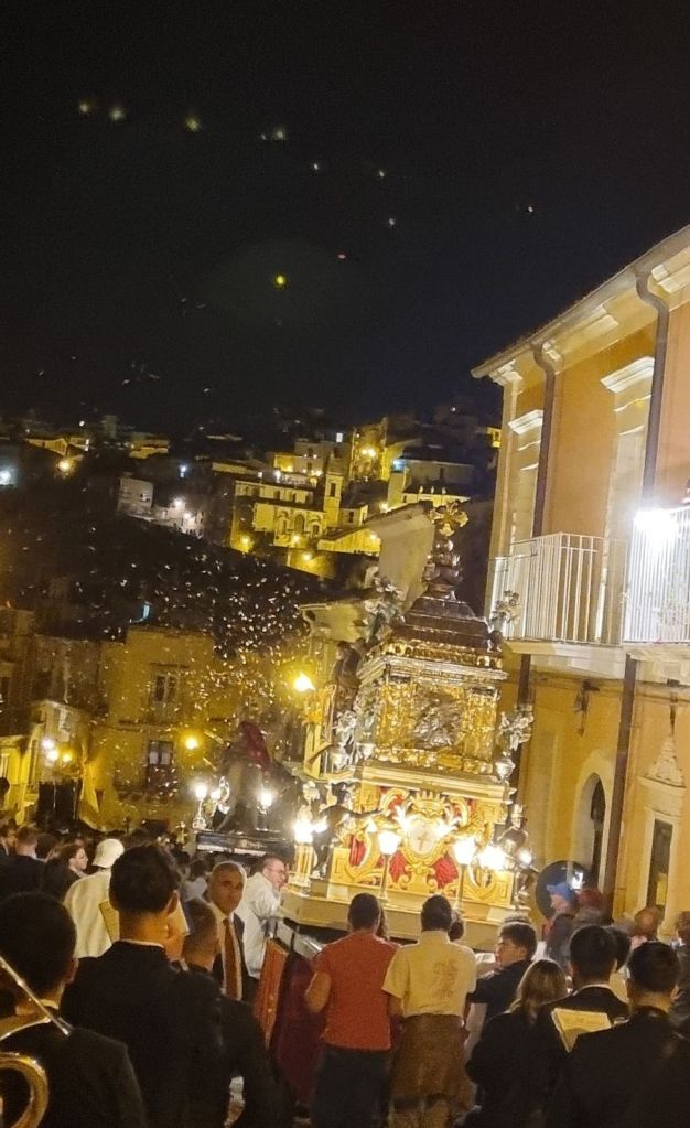 Nun waren bei dieser Kirche wieder steile Treppen zu bewältigen. Aber wie? Es war ein wahres Schauspiel. An beiden Seiten stellten sich die Männer in Ketten Arm in Arm auf und dann ging es mit viel Schwung hinauf. Irre! Die Reliquien blieben über Nacht hier, nur San Giorgio zog weiter. Zum Abschluss noch ein Feuerwerk. Auf dem Heimweg genieße ich bei einem Abenddrink noch den Blick auf die nächtliche Altstadt mit den ganzen Lichterdekorationen.