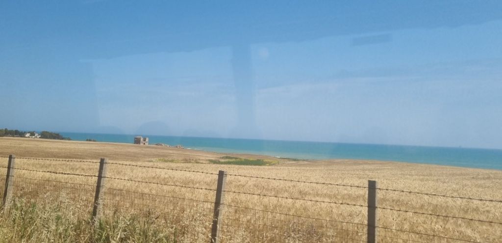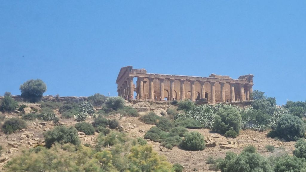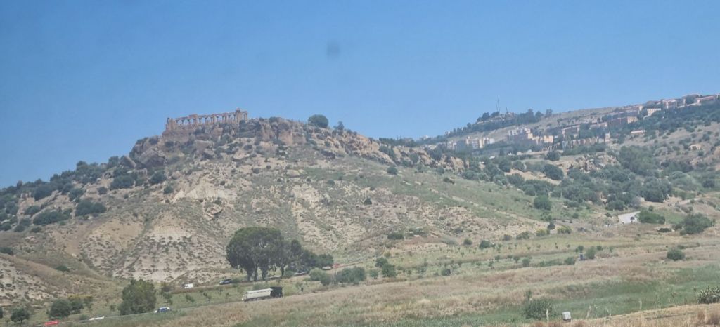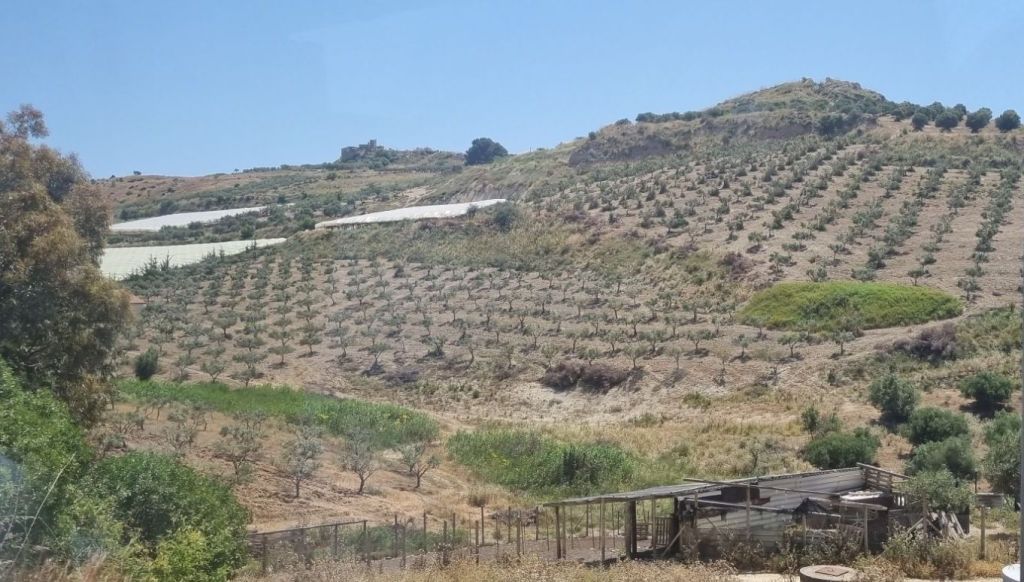Am Montag geht es weiter. Über Agrigento erfolgt meine Weiterfahrt nach Gela. Der Hotel-Barkeeper hat mir noch den Tipp gegeben ab Agrigent den Bus statt die Bahn nach Gela zu nehmen, das geht schneller uns ohne Umsteigen. Wir fahren also mit dem Bus durch die Obst- und Gemüseabteilung der sizilianischen Landwirtschaft. Die Gegend ist voll mit Obstplantagen, in denen Wein und anderes unter Zeltplanen und Vogelschutznetzen wächst. Und wenn gar nichts mehr geht, dann wachsen noch Olivenbäume. Die Gegend wird ansonsten flacher und karger.