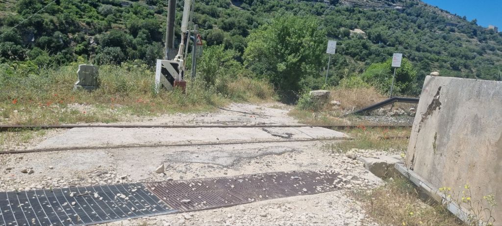 Das nächste Hinternis ist ein Bahnübergang, diesmal mit geschlossener Schranke. Aus irgendeinem Grund überlege ich, ob diese Schranke überhaupt bedient wird oder ob die nicht einfach immer unten ist, damit keine Kuh auf die Gleise läuft, egal ob ein Zug kommt? Muss man irgendwo anrufen, wenn man durch will? Wer sollte hier entlang kommen – außer Wanderer? Immerhin ist dies auch ein Stück der Via Francigena. Mich würde hier nichts mehr wundern.