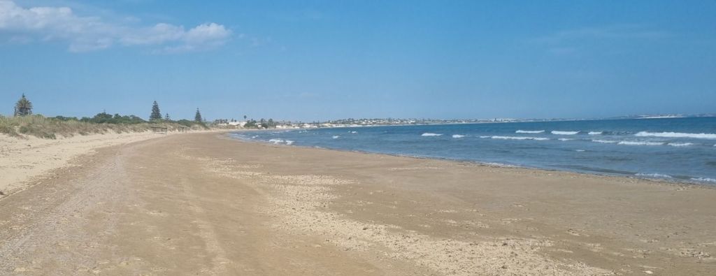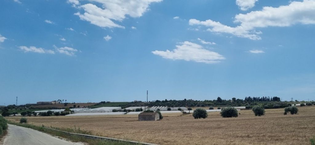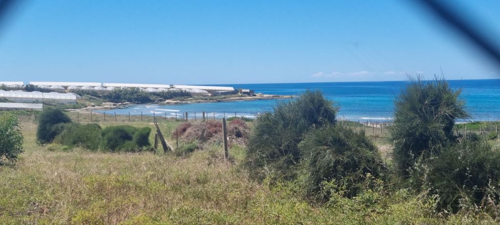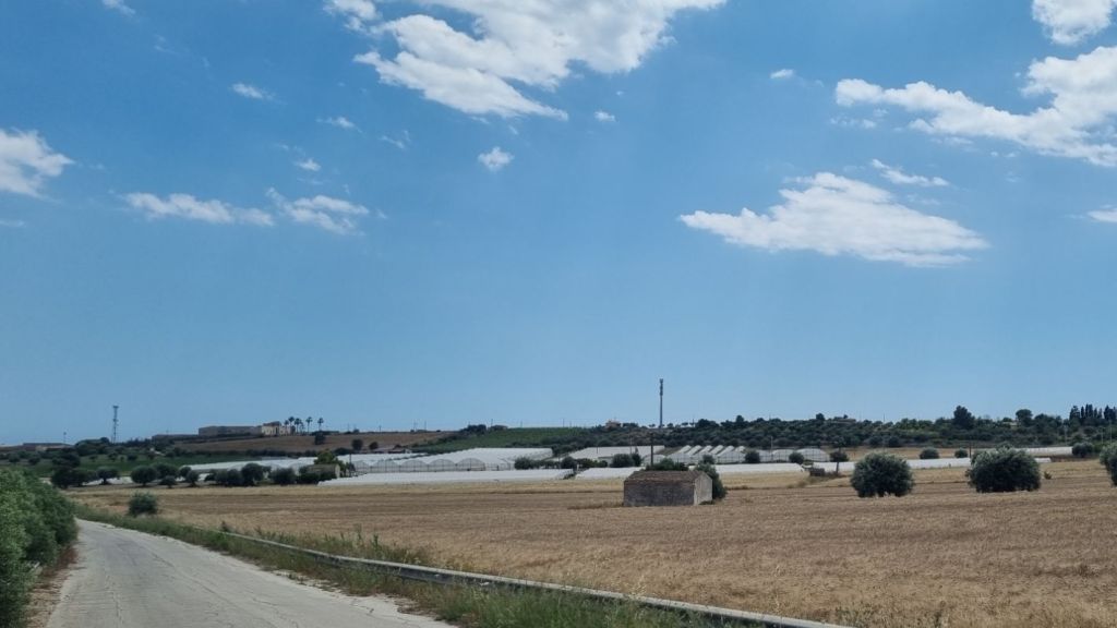 Nun geht’s an die Südspitze Siziliens. Immer am Meer entlang – Nein nicht idiyllisch am Strand, sondern auf der Straße zwischen den Gewächshäusern mit Melonen und Tomaten entlang. Manchmal reichen die Gewächshäuser buchstäblich ans Wasser, meistens ist der kurze Blick ans Meer aber doch sehr schön.