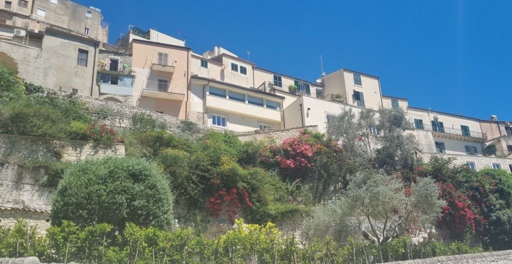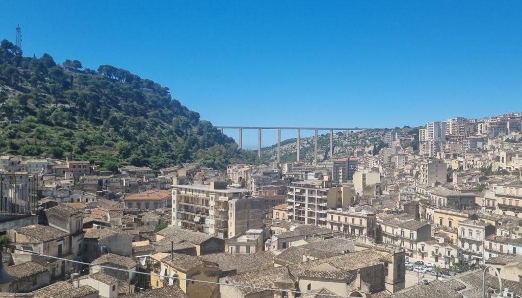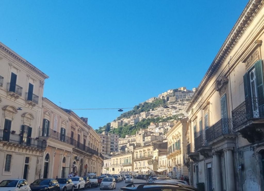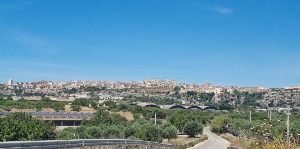 Weiter bergauf gab es oben noch einmal einen schönen Blick auf Ragusa. Der Rest des Weges bis Modica ist relativ unaufgeregt. Ein wenig Wanderweg erklettern und dann Nebenstraßen immer geradeaus. Endlich angekommen erstmal in ein Caffé und eine Granita zur Erfrischung. Eine Supersache, diese Granitas. Halbgefrohrenes Wassereis mit Fruchtgeschmack, am besten Limone. Erfrischend und Flüssigkeit in einem. 😁