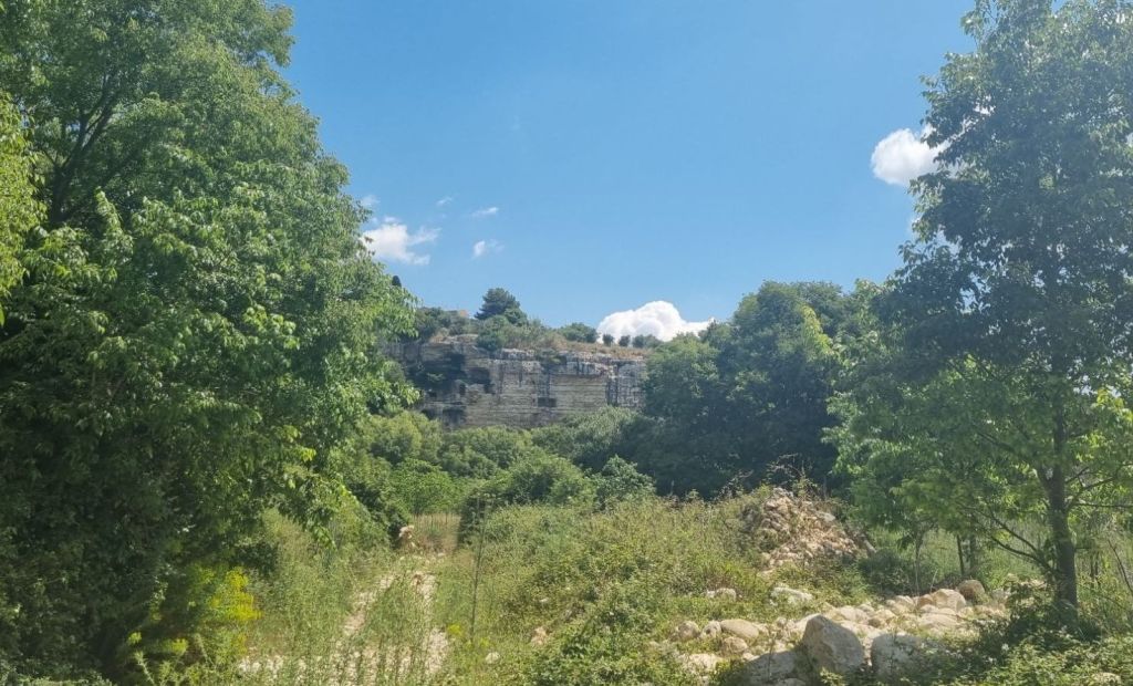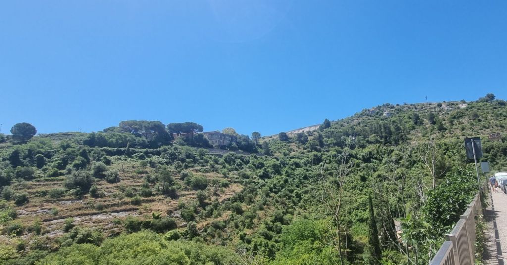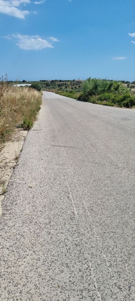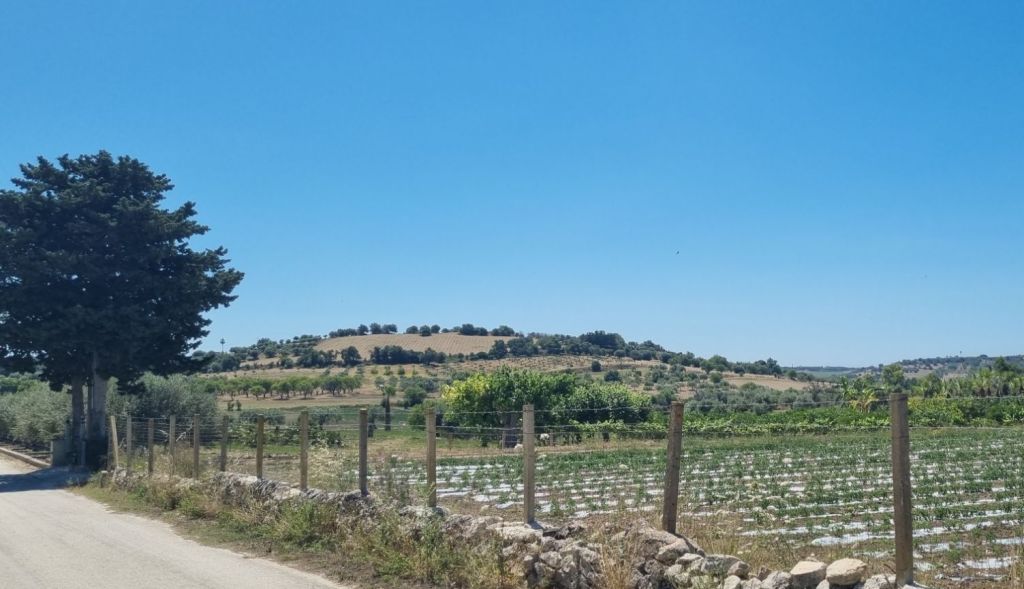 Los geht es zunächst Richtung Altstadt Ragusa-Ibla. Nach der Altstadt soll es über eine kleine Nebenstraße durch das Tal hinüber zur anderen Seite zum nächsten Hügel gehen. Aber mal wieder hat irgendein Italiener einen Zaun aufgestellt – Privatstraße. Der Weg dahinter ist uneinsichtig vor Gestrüpp, Ruinen schauen hervor. Es ist zwar ein Weg erkennbar und mittlerweile hält mich ja ein einfaches Schild und ein Bauzaun nicht unbedingt auf, aber es ist nicht erkennbar, ob man nicht bei jemanden im Hof rauskäme. Dann gäbe es nur wieder Hundegebell… Heute mal nicht, obwohl mich gerade aufgrund des späteren Starts ein Umweg etwas ärgert.