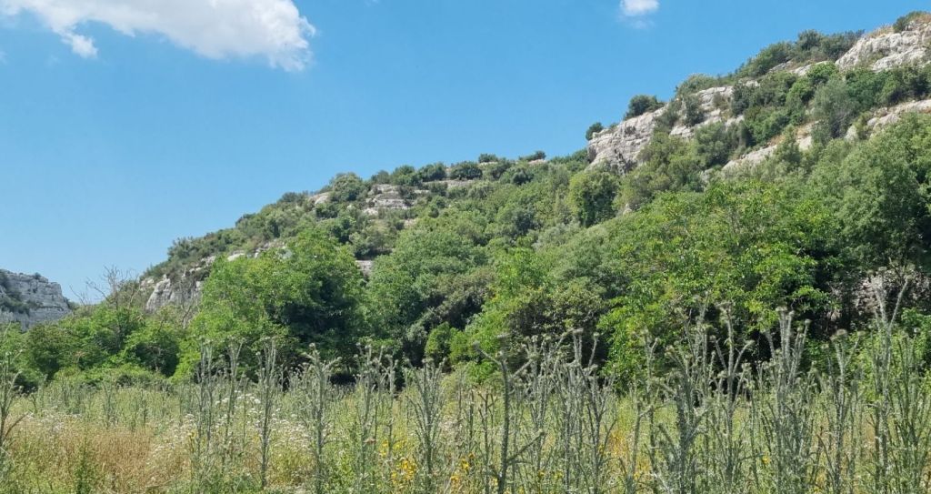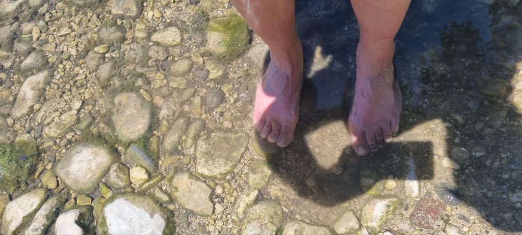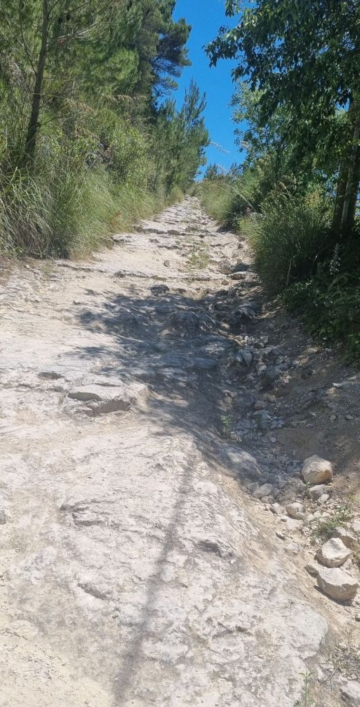 Es geht zwar am Anfang noch spannend die felsengesäumte Straße eAllerdings ging es nur Straße entlang und alles in der Sonne. Keine Straßenbäume. Zum Glück bin ich eingecremt und vorgebräunt. Nach dem Duschen Aftersun – oder wie es hier heißt Doposole – und das Rot geht ohne Schmerzen in noch mehr Braun über.