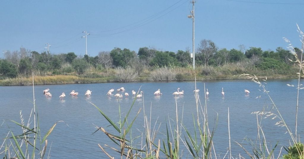 Die letzten vier Kilometer, es trage ich also nun auch noch eine Wassermelone. Und ich freue mich auf die fruchtige Erfrischung am Abend und am nächsten Tag. Aber geht an einer Lagune hindurch – Flamingos! 🤗🤩🦩
