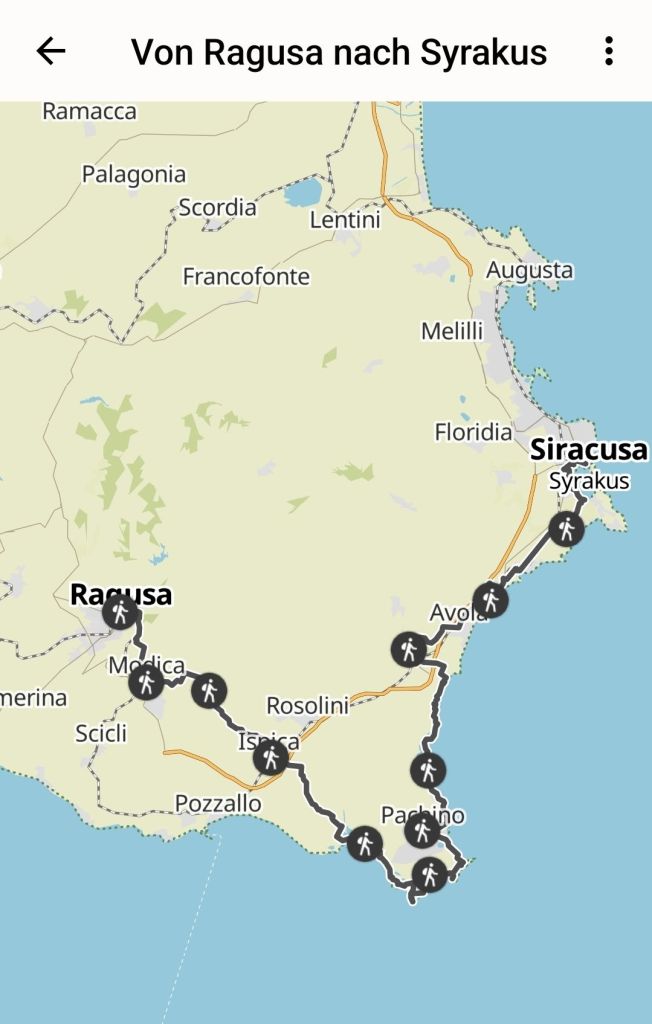 Diese Woche fängt mal an einem Montag an. Nachdem ich mich am Morgen noch kurz erfolgreich um meine berufliche Zukunft gekümmert habe geht es etwas später also sonst, gegen 11.00 Uhr los. Start zur 2. Wanderung auf Sizilien. Es geht von Ragusa zum südlichsten Ende Siziliens und danach mehr oder weniger an der Küste entlang nach Siracusa.
